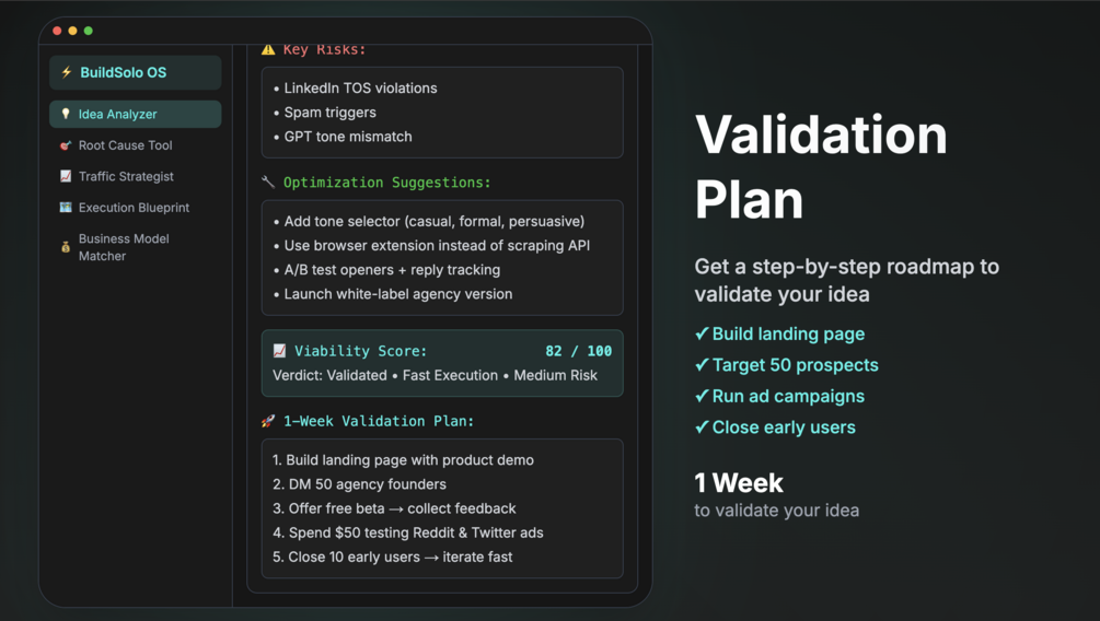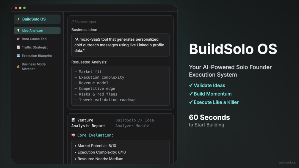 BuildSolo is a tactical AI system that turns your raw startup ideas into structured execution blueprints, without fluff or bottlenecks.
