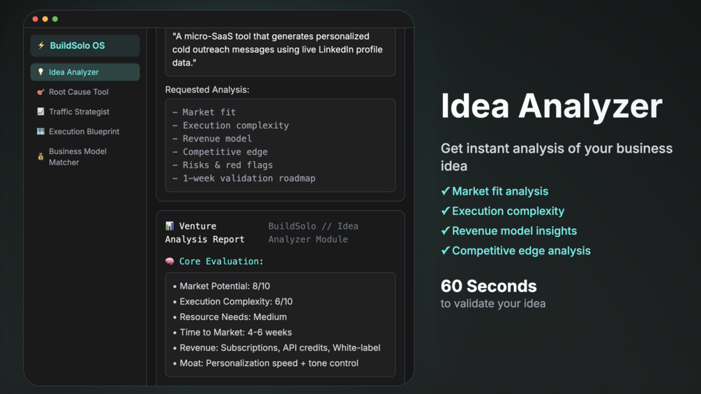 BuildSolo is a tactical AI system that turns your raw startup ideas into structured execution blueprints, without fluff or bottlenecks.